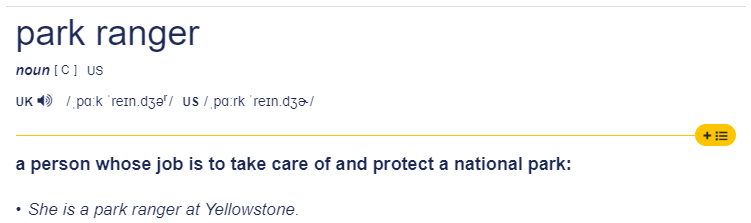 캠브리지 영어사전에 따르면, 파크 레인저는 '국립공원을 돌보고 보호하는 일을 하는 사람'으로 정의됩니다.
