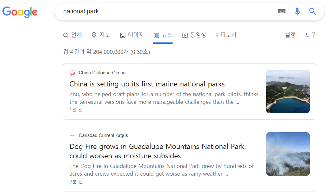자, 이제 테스트해볼까요?! Google 뉴스에서 'national park' 검색결과 창이 뜨도록 코드를 작성해 봅니다.