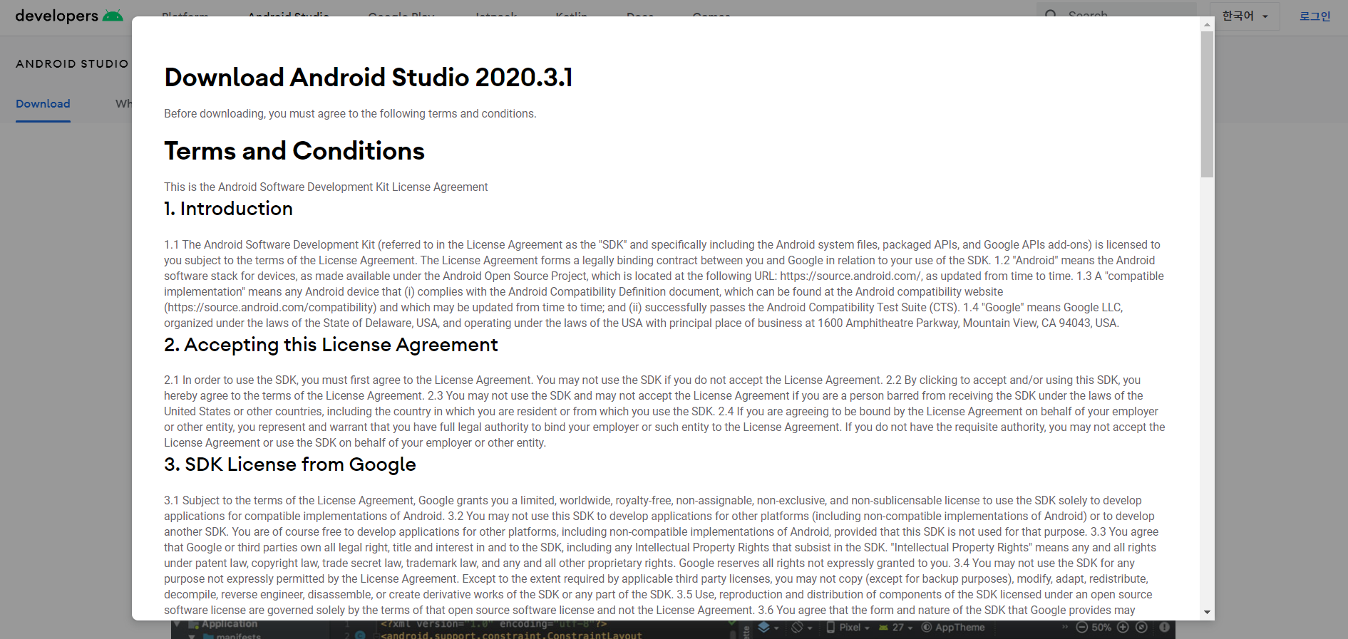 Android 스튜디오에 관한 Terms ansd Conditions(이용 약관)이 표시됩니다.