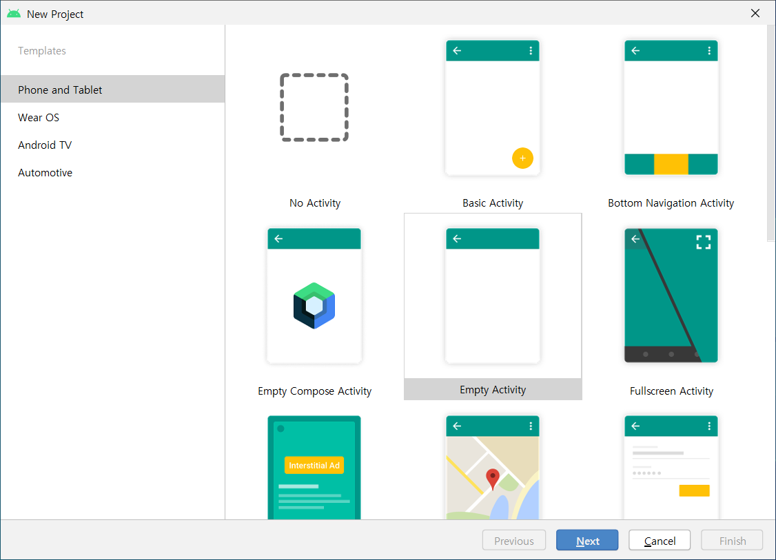 제공되는 템플릿 중 'Empty Activity'를 선택해 보겠습니다.