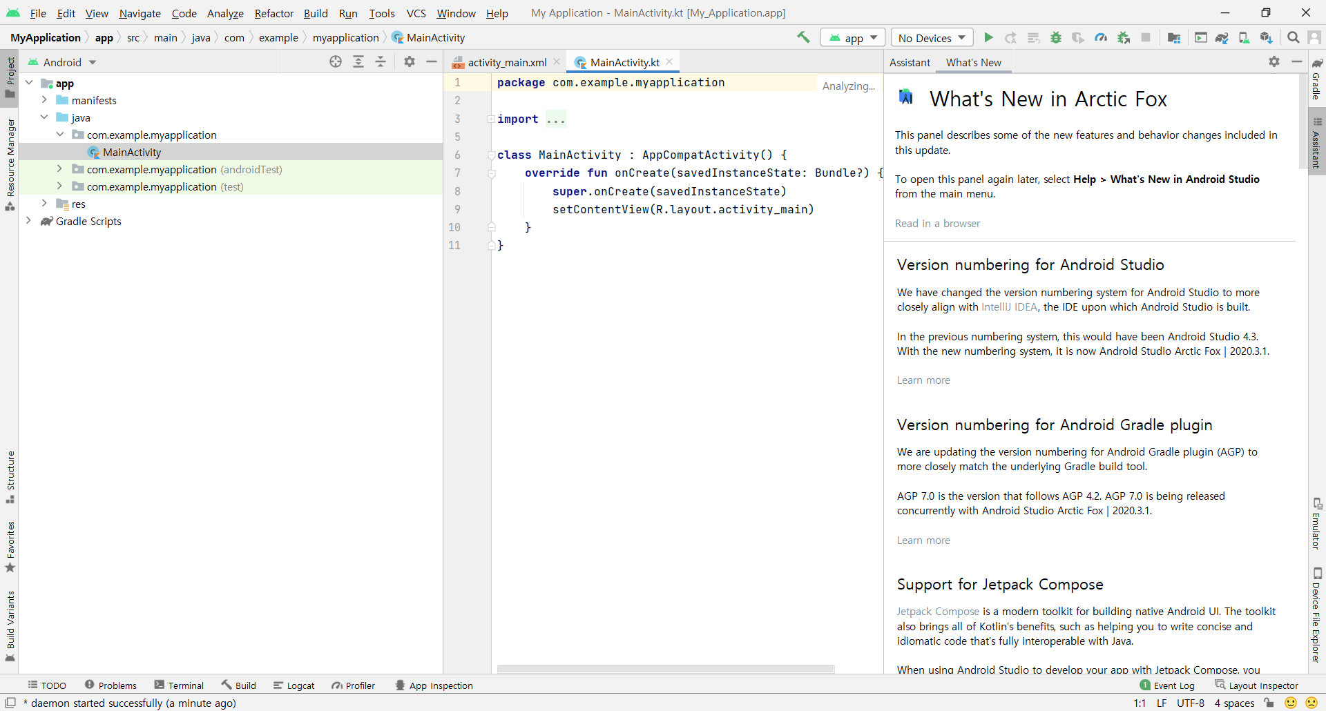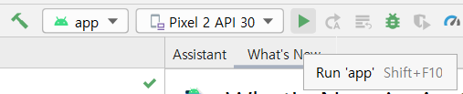 이제 아래와 같이 Run 'app' 버튼을 클릭하시면, 내 앱을 구동해 보실 수 있습니다. 'Hello World!' 문구가 반갑네요! 여기까지 Windows 10에서 Android 스튜디오 설치하는 과정을 정리해 봤습니다.