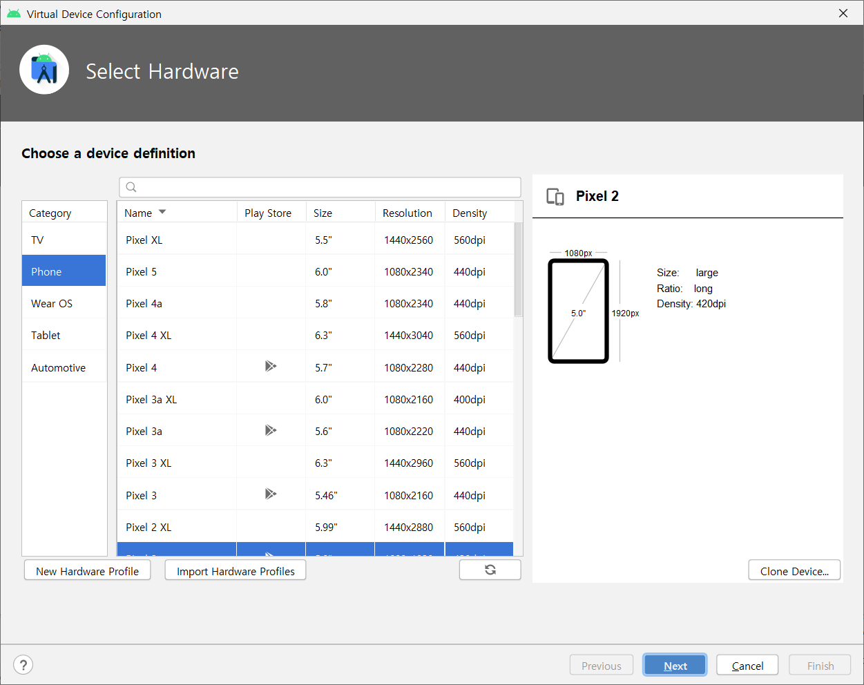 하드웨어를 선택합니다. 저는 구글의 안드로이드 스마트폰 'Pixel 2(픽셀 2)'를 선택해 봅니다.