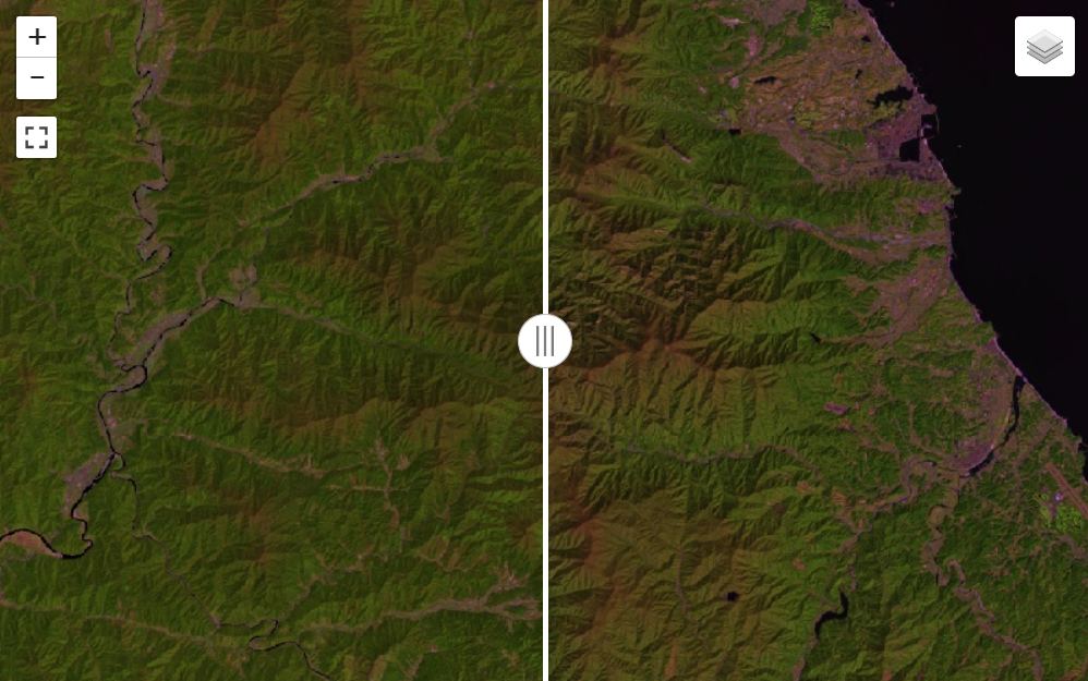 GFC 데이터셋은 2000년과 2022년의 구름 제거 이미지 합성 밴드들을 제공하고 있습니다. 지도 스와이프 기능을 활용해 동일지역 내 두 시기 이미지를 비교해 보겠습니다. 왼쪽 레이어는 2000년, 오른쪽 레이어는 2022년을 지정한 결과입니다.