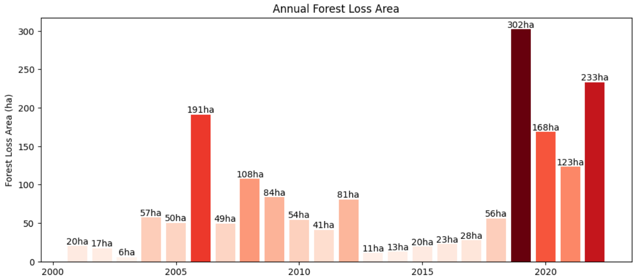 - 2001년부터 2022년까지의 기간 동안 산림손실 면적을 계산하고, 그 결과를 그래프로 시각화해봅니다.