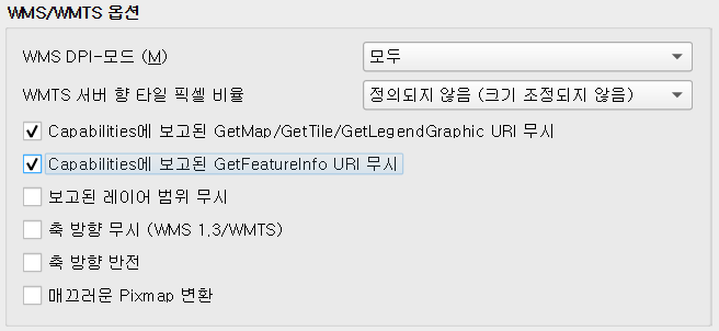WMS/WMTS 옵션에서 아래 2개 항목을 체크합니다.