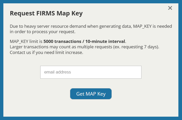 데이터 생성 시 서버 자원 수요가 많기 때문에, 요청을 처리하려면 MAP_KEY가 필요합니다. MAP_KEY는 10분 간격당 5000건의 트랜잭션으로 제한되며, 대용량 요청(예: 7일치 데이터 요청)은 여러 개의 요청으로 계산될 수 있습니다. 제한 상향이 필요한 경우 별도 문의해야 합니다.