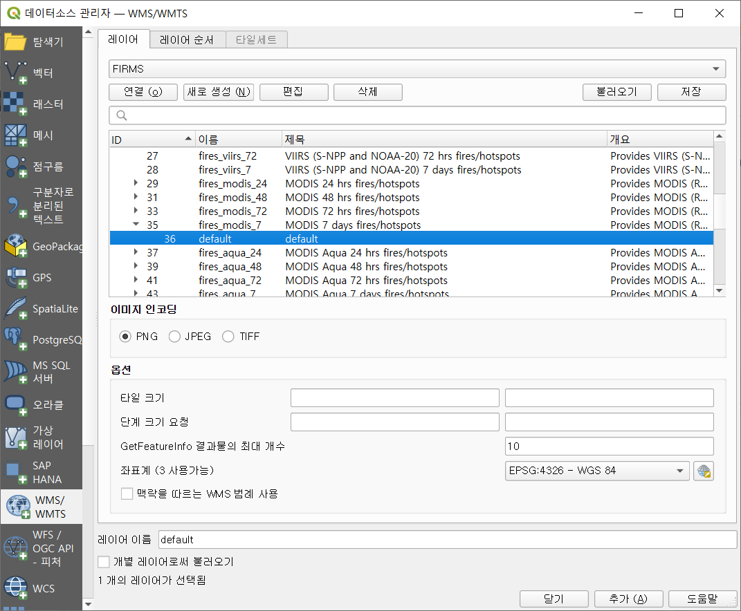 "연결(Connect)" 버튼을 클릭하여 사용 가능한 FIRMS 레이어 목록을 불러옵니다. 여기서는 목록에서 "MODIS 7 days fires/hotspots"을 선택해 보겠습니다. 투명한 이미지를 사용하려면 이미지 인코딩은 "PNG" 형식을 사용합니다.