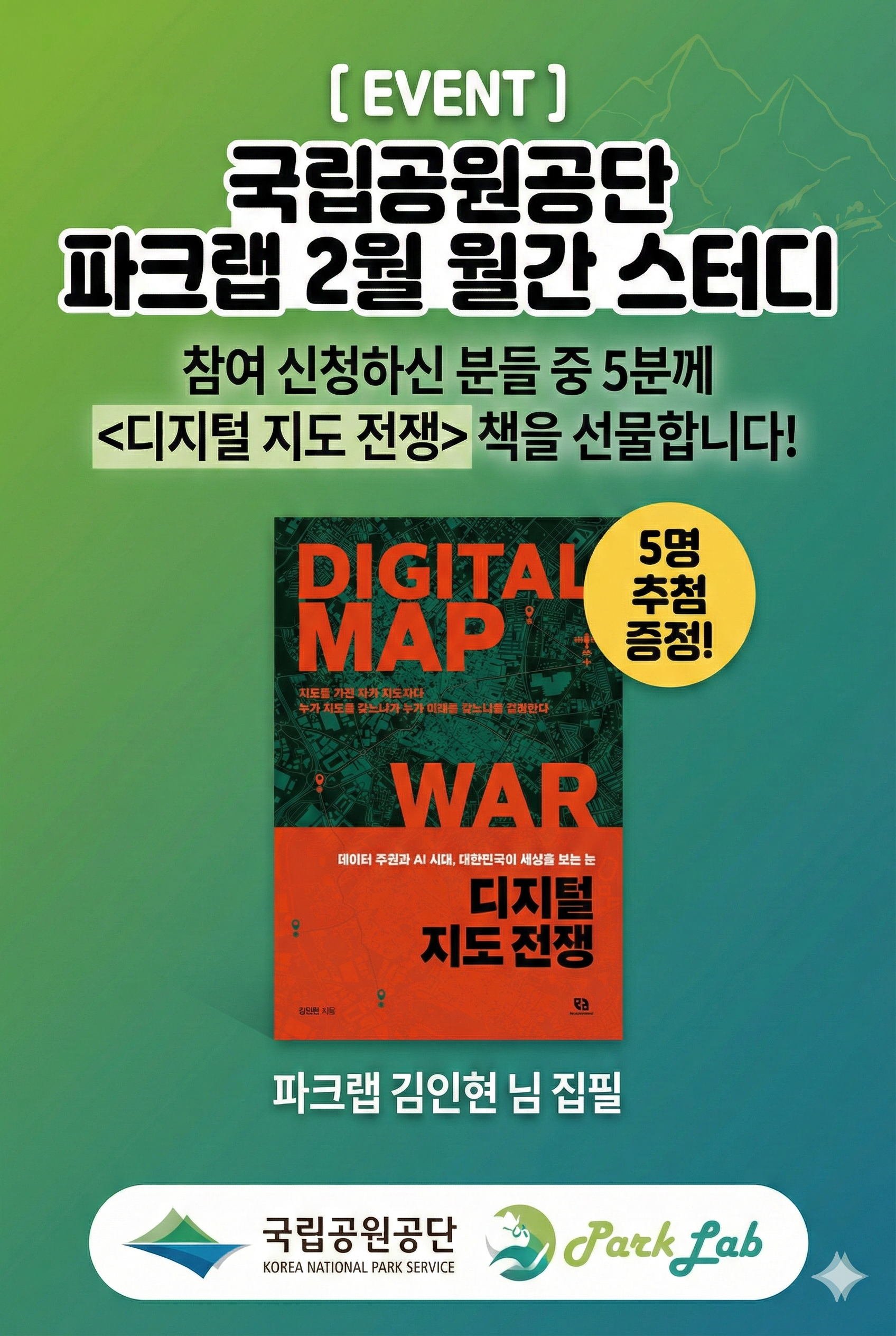 우리 파크랩의 김인현 님이 좋은 책을 써주셔서 작은 이벤트를 준비했습니다. "국립공원공단 파크랩 2월 월간 스터디" 신청자 분들 중 추첨을 통해 5분께 "디지털 지도 전쟁" 책을 선물합니다! 이벤트 때문에 스터디 신청하시는 분은 안 계시겠죠?! 저는 늘 스터디에 진심입니다.