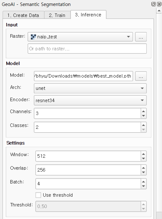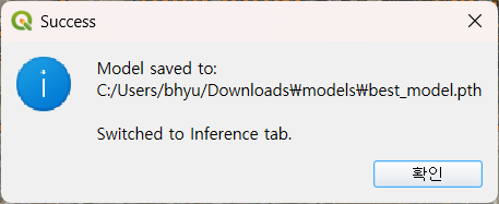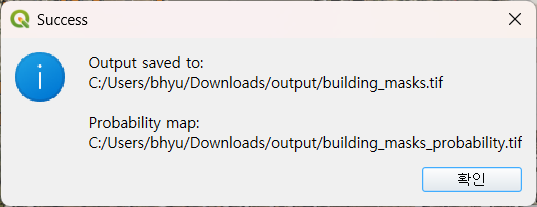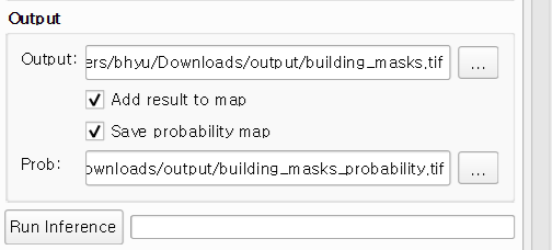 - 추론 수행: 새로운 래스터 레이어를 선택하고 학습된 모델 파일을 로드하여 실행합니다.