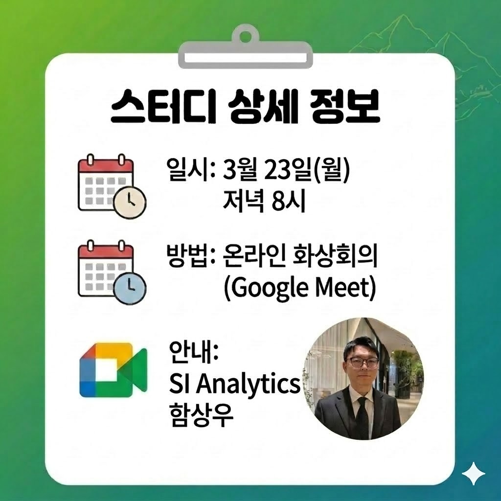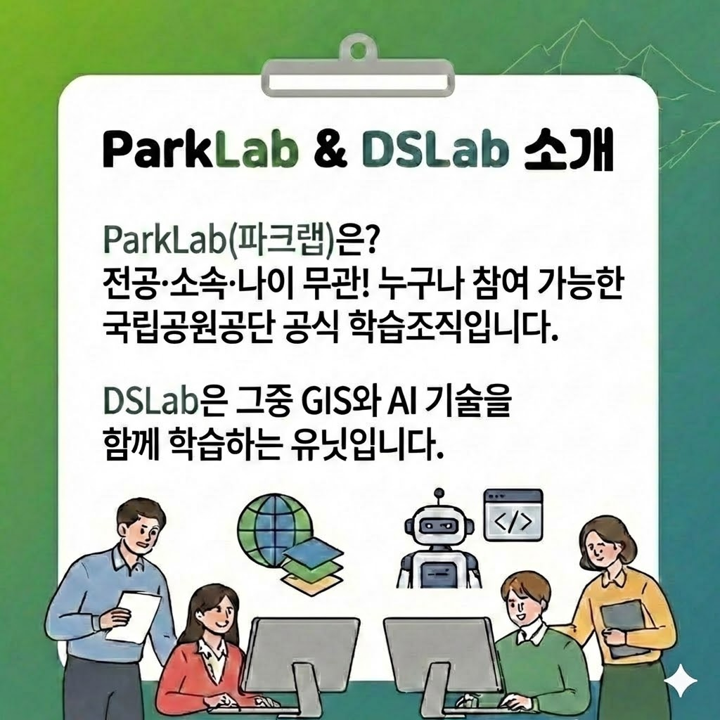 안녕하세요? "국립공원공단 파크랩 3월 월간 스터디" 안내 드립니다! 이번 달 학습 주제는 "Tileslearner - Claude & Claude Code와 함께 GIS/ML 연구하기"입니다. 학습을 안내해주실 SI Analytics 함상우님께 미리 감사드립니다.