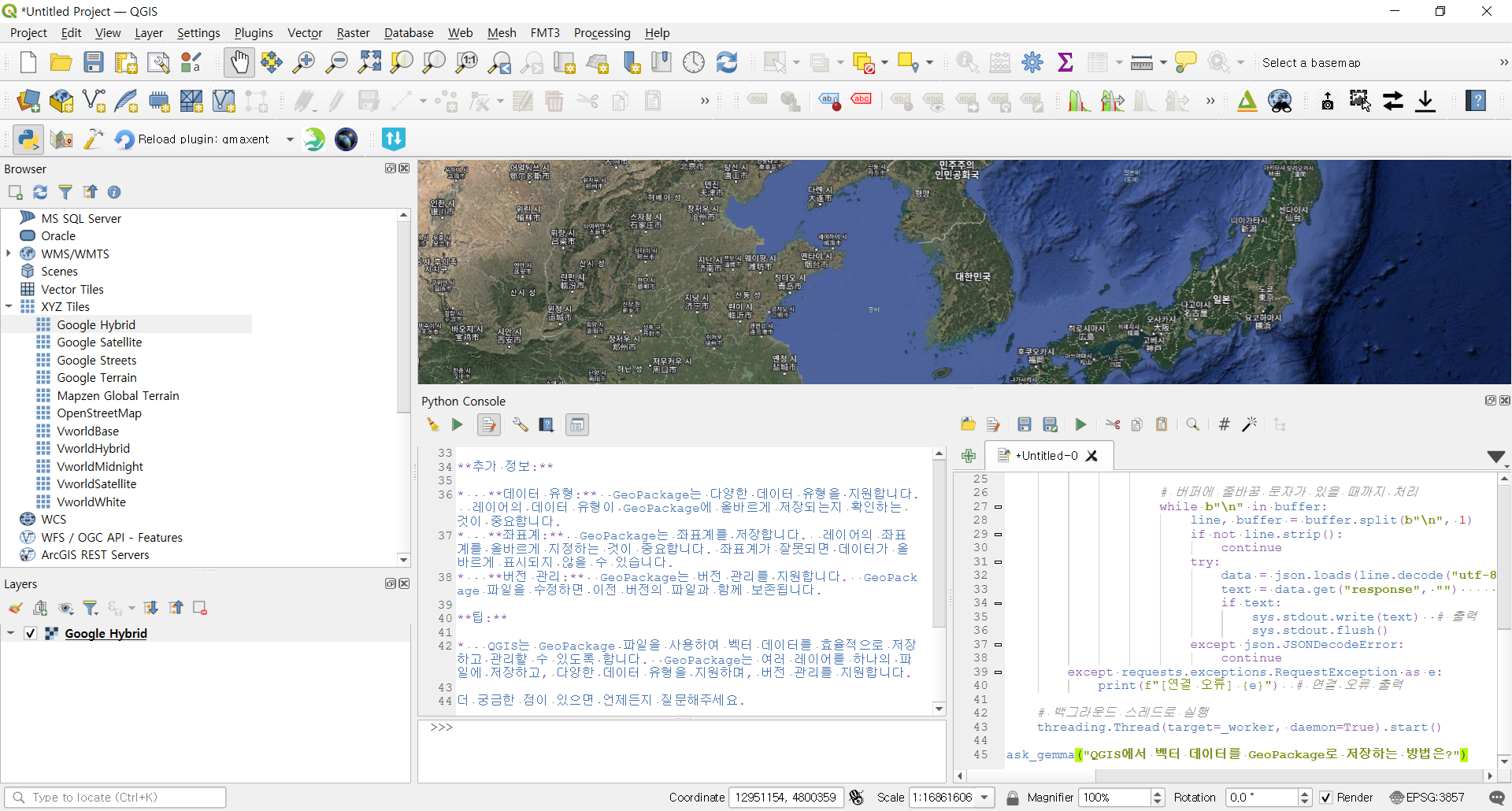 안녕하세요? 이번 글에서는 QGIS 파이썬 콘솔에서 Gemma 3 LLM과 대화하는 코드를 소개해 보겠습니다. Gemma 3 LLM 설치 방법은 앞서 작성한 아래 글을 참고하시면 됩니다. Ollama(올라마): 로컬에서 LLM(Gemma 3 모델) 실행하기안녕하세요? 이번 글에서는 로컬에서 대규모 언어 모델(LLMs: Large Language Models)을 바로 시작해볼 수 있는 Ollama(올라마)를 이용해, Google의 Gemma(젬마) 3 모델 실행 방법을 학습해 보겠습니다. Ollama는foss4g.tistory.com 아래 코드는 로컬 Ollama 서버에서 Gemma 모델을 통해 질문에 실시간으로 응답을 받아 출력하는 비동기 함수입니다. 이를 통해 명령어 입력 후 즉시 응답을 받아볼 수 있..